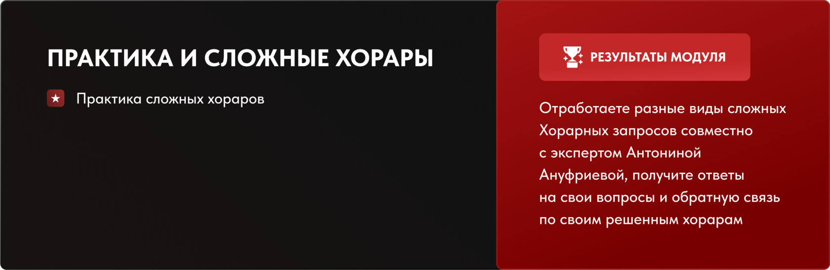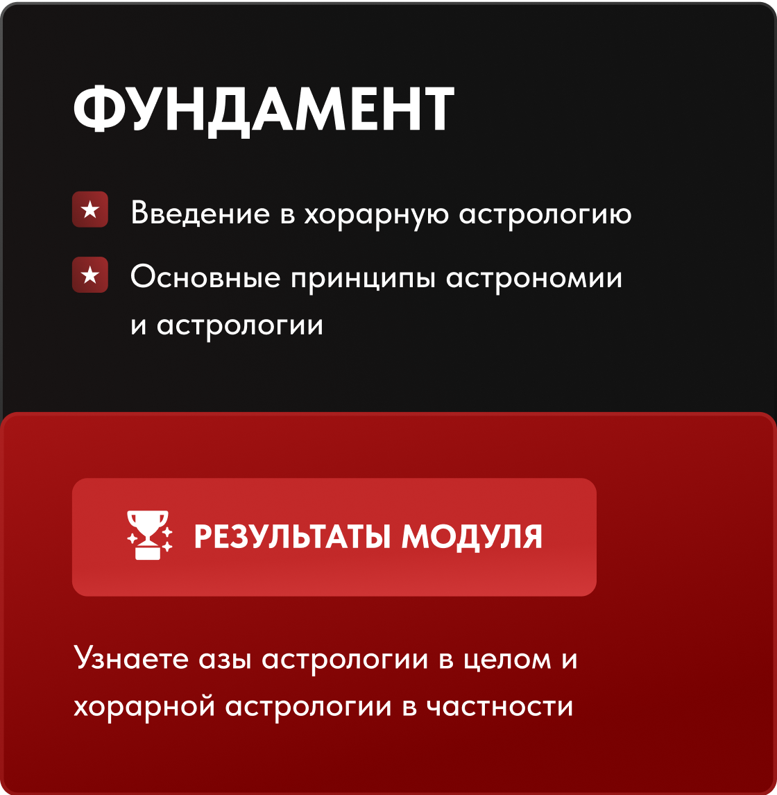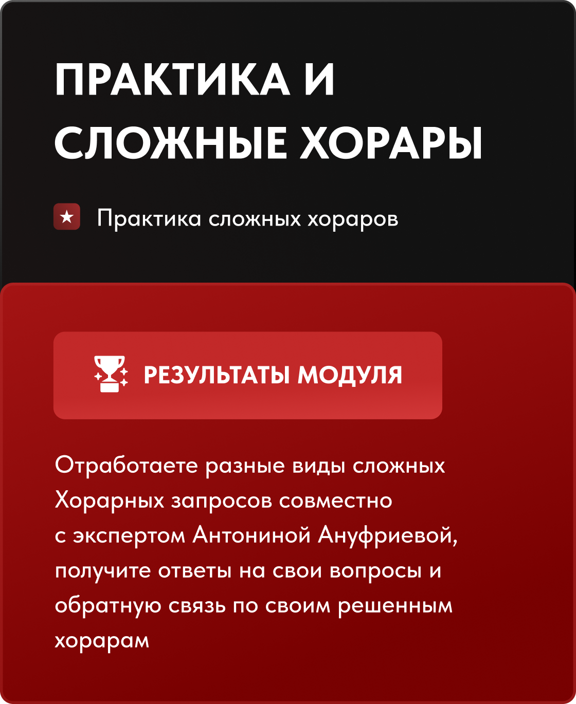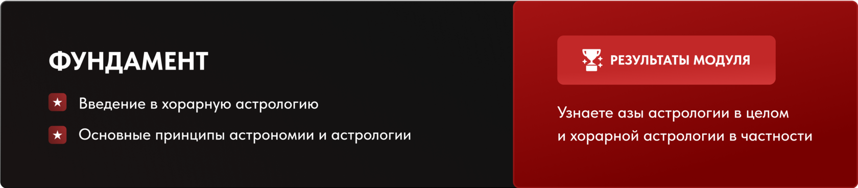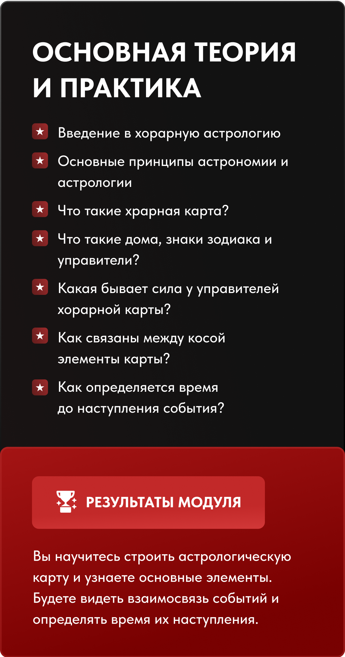 МОДУЛЬ 1. Основная теория и практика Урок 3. Дома в хорарной карте Урок 4. Акцидентальное управление Урок 5. Натуральное значение планет Урок 6. Свойство знаков зодиака Урок 7. Эссенциальное достоинство планет Урок 8. Рецепции Урок 9. Практика Урок 10. Знакомство с аспектами Урок 11. Акцидентальное достоинство планет. Ретроградность, звезды Урок 12. Аспекты Урок 13. Время в карте Урок 14. Антисы. Жребии и высшие планеты