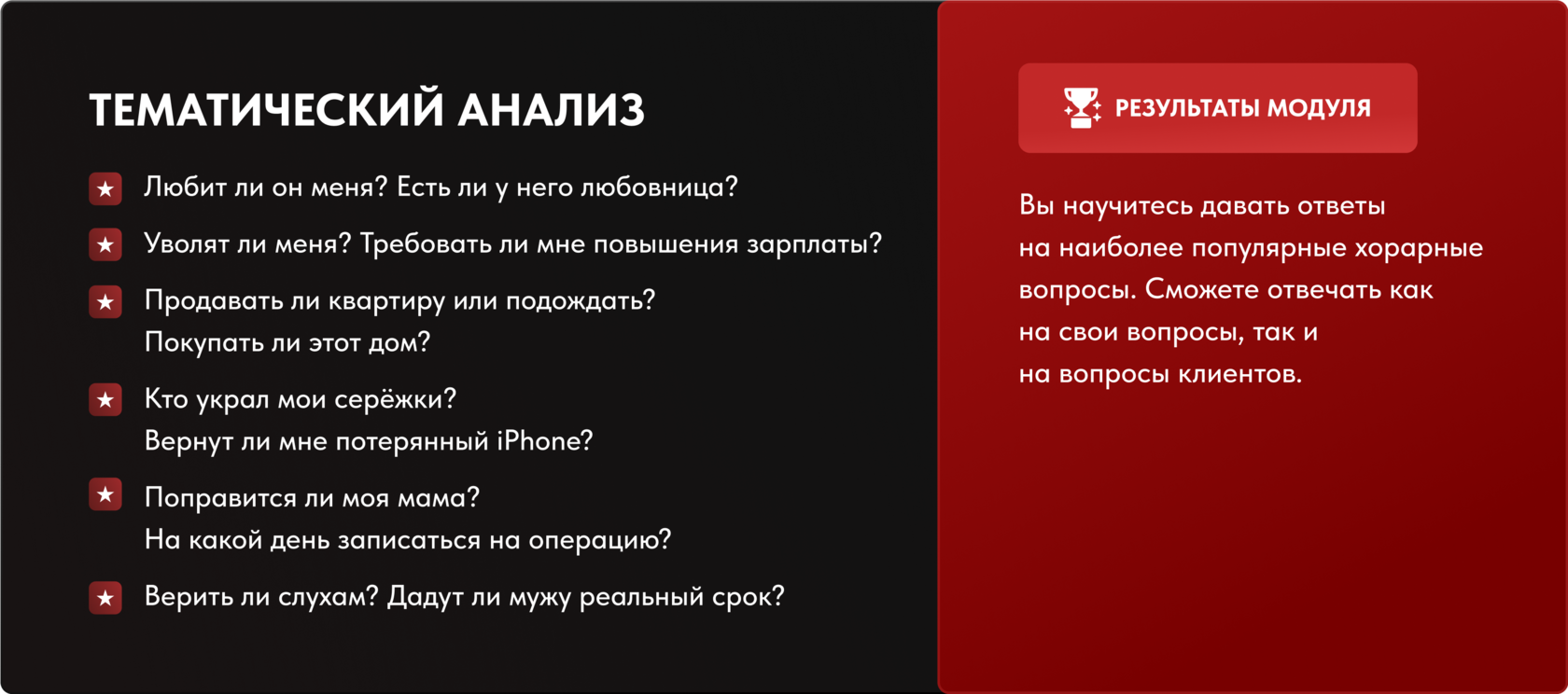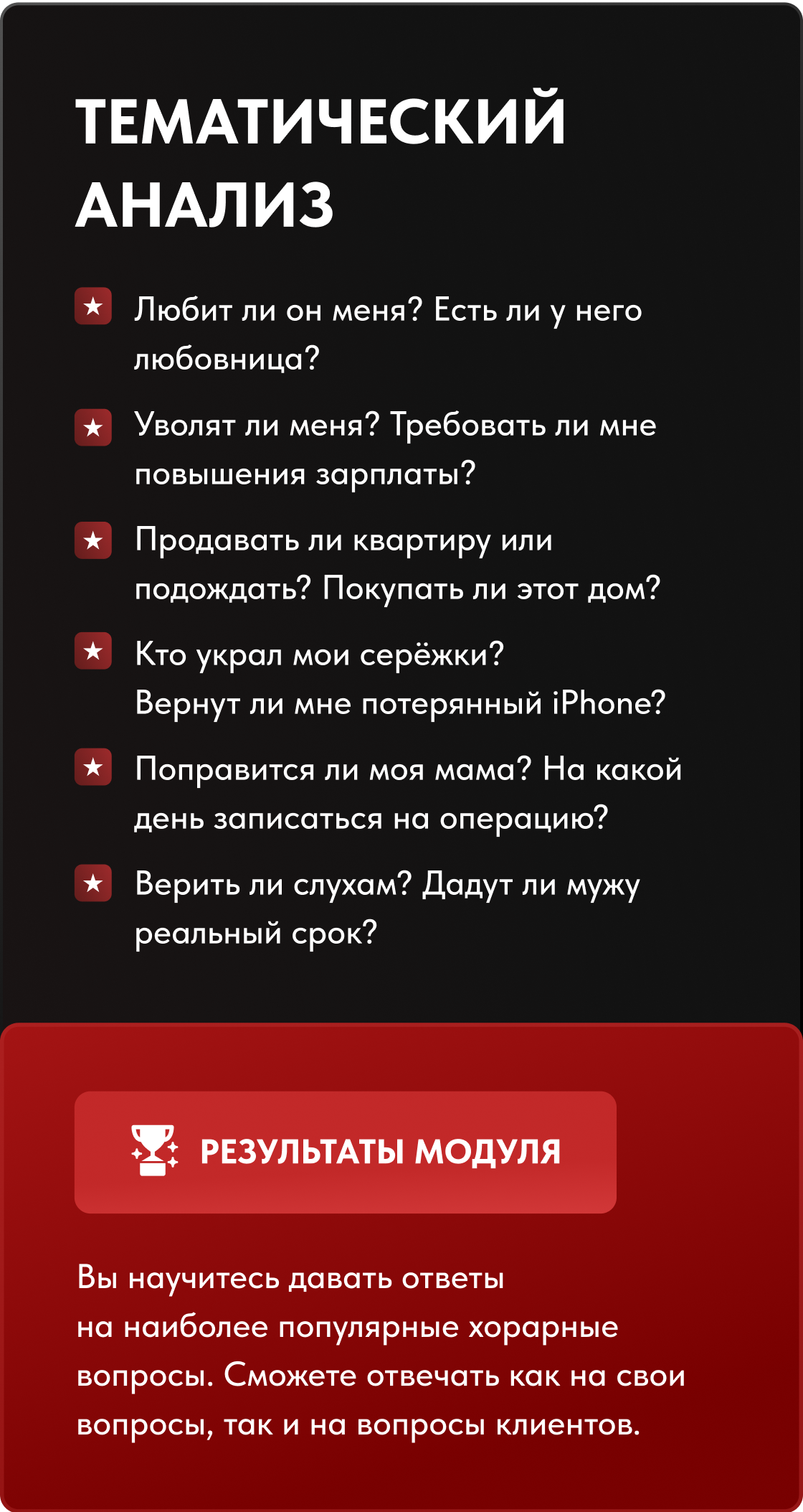 МОДУЛЬ 2. Тематический анализ Урок 15. Отношения. Мужчины и женщины, чувства, измены. Урок 16. Отношения. Брак, развод. Урок 17. Беременность, фертильность, зачатие. Эко, роды. Урок 18. Практика Урок 19. Работа, бизнес, кошелек Урок 20. Сделки, коммерция, операции с недвижимостью Урок 21. Финансовые операции. Инвестиции, ставки. Урок 22. Переезды, путешествия, визы. Знания, экзамены, обучения Урок 23. Поиск, кража. Урок 24. Смерть, болезнь, суд, тюрьма Урок 25. Практика Урок 26. Вопросы здоровья, операции, диагностика Урок 27. Слухи, сплетни. Сновидения. Сглазы. Урок 28. Практика Урок 29. Элекции, прогноз. Погода Урок 30. Профориентация Урок 31. Спорт, конкурсы, победа Урок 32. Политика, выборы, государственные хорары