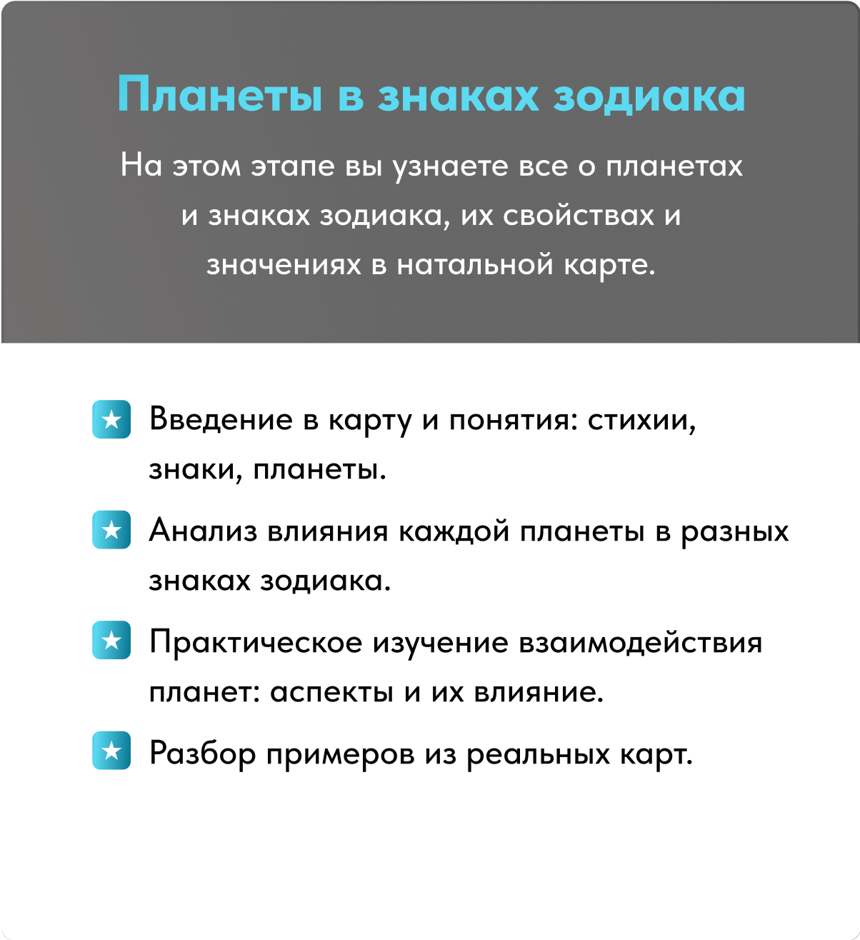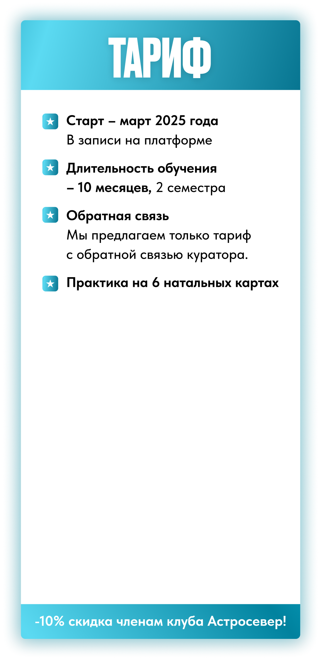 Два семестра погружения в практическую натальную астрологию. Вы понимаете закономерности, которые влияют на характер и судьбу человека, и научитесь формировать общий прогноз по Натальной карте